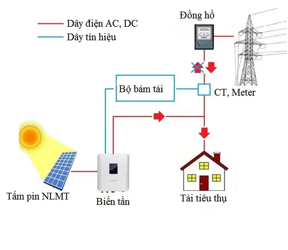 Nguyên lý hoạt động : Hệ thống điện NLMT hòa lưới bám tải sẽ ưu tiên sử dụng điện do tấm pin NLMT tạo ra cung cấp cho các phụ tải trong nhà. Ban đêm hoặc khi tấm pin NLMT không tạo ra đủ điện, hệ thống sẽ tự động lấy điện lưới bù vào phần thiếu hụt đó.