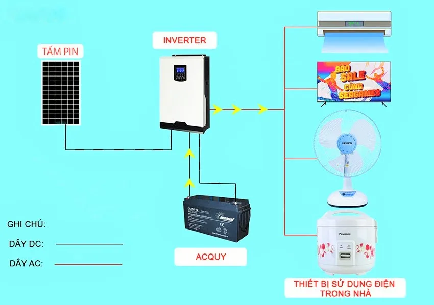 Nguyên lý hoạt động : Các tấm pin măng lượng mặt trời hấp thụ ánh sáng mặt trời sản sinh ra dòng điện DC, dòng điện này qua biến tần để tạo ra dòng điện AC 220V sử dụng cho các thiết bị điện trong nhà, phần điện dư thừa được nạp vào bộ lưu trữ điện (ắc quy, pin …) để sử dụng vào ban đêm hoặc khi mất điện mà ánh nắng không đủ.