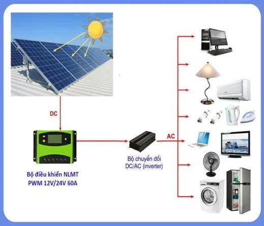 Nguyên lý hoạt động: Các tấm pin năng lượng mặt trời ( NLMT) hấp thụ ánh sáng mặt trời sản sinh ra dòng điện DC, dòng điện này qua bộ điều khiển NLMT và biến tần để tạo ra dòng điện AC 220V sử dụng cho các thiết bị điện trong nhà.