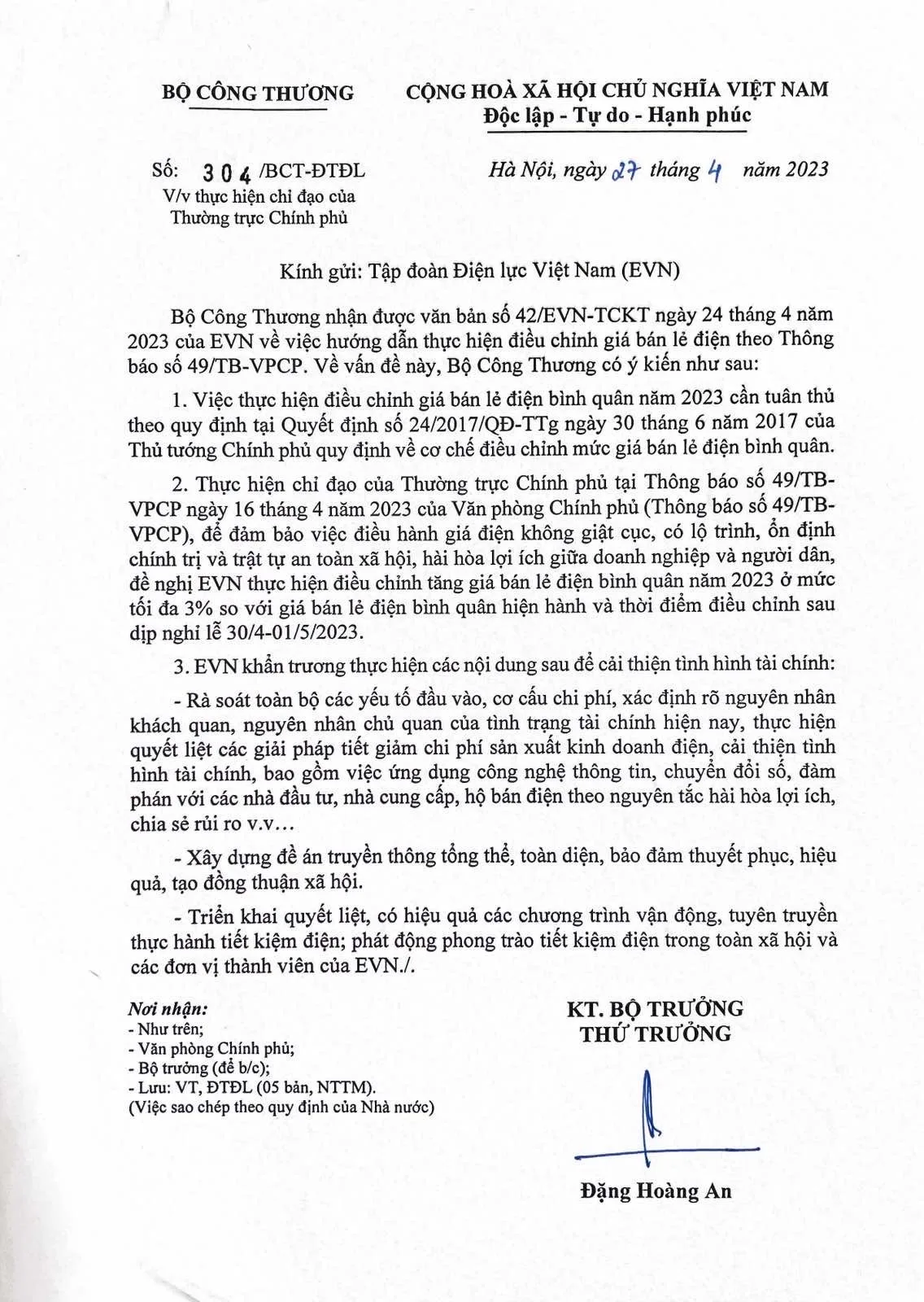 Như vậy là sau một thời gian xét duyệt, Bộ Công Thương vừa có văn bản (số 304/BCT-ĐTĐL) do Thứ trưởng Đặng Hoàng An ký (ngày 27/4/2023), đồng ý cho phép Tập đoàn Điện lực Việt Nam (EVN) điều chỉnh tăng giá bán lẻ điện ở mức tối đa 3% so với giá bán lẻ điện bình quân hiện hành. Thời điểm điều chỉnh giá điện là sau dịp nghỉ lễ 30/4-1/5. Mức tăng như vậy là khá hài hòa giữa lợi ích của người tiêu dùng, nền kinh tế và tình trạng khó khăn của tập đoàn điện lực Việt Nam (EVN)