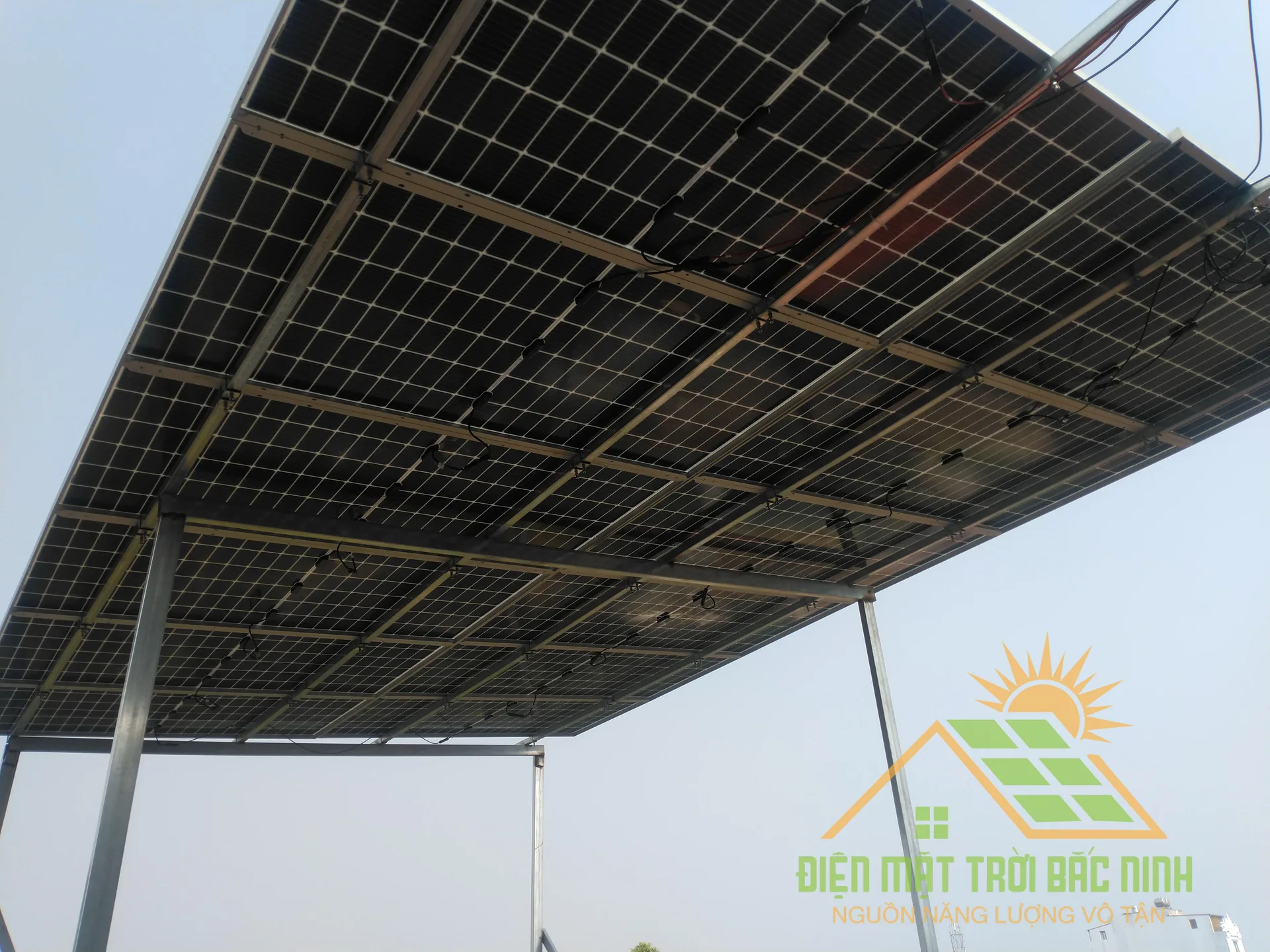 Tấm pin năng lượng mặt trời chủ đầu tư sử dụng bao gồm 12 tấm pin thương hiệu JDS Solar công suất 410 Wp fullblack được chủ đầu tư nhập khẩu trực tiếp từ Trung Quốc cho biến tần phụ. Biến tần chính, chúng tôi sử dụng 12 tấm pin thương hiệu LONGi hai mặt kính công suất 450 Wp. Hệ thống tấm pin NLMT được gắn trên khung chuyên dụng được thiết kế riêng.