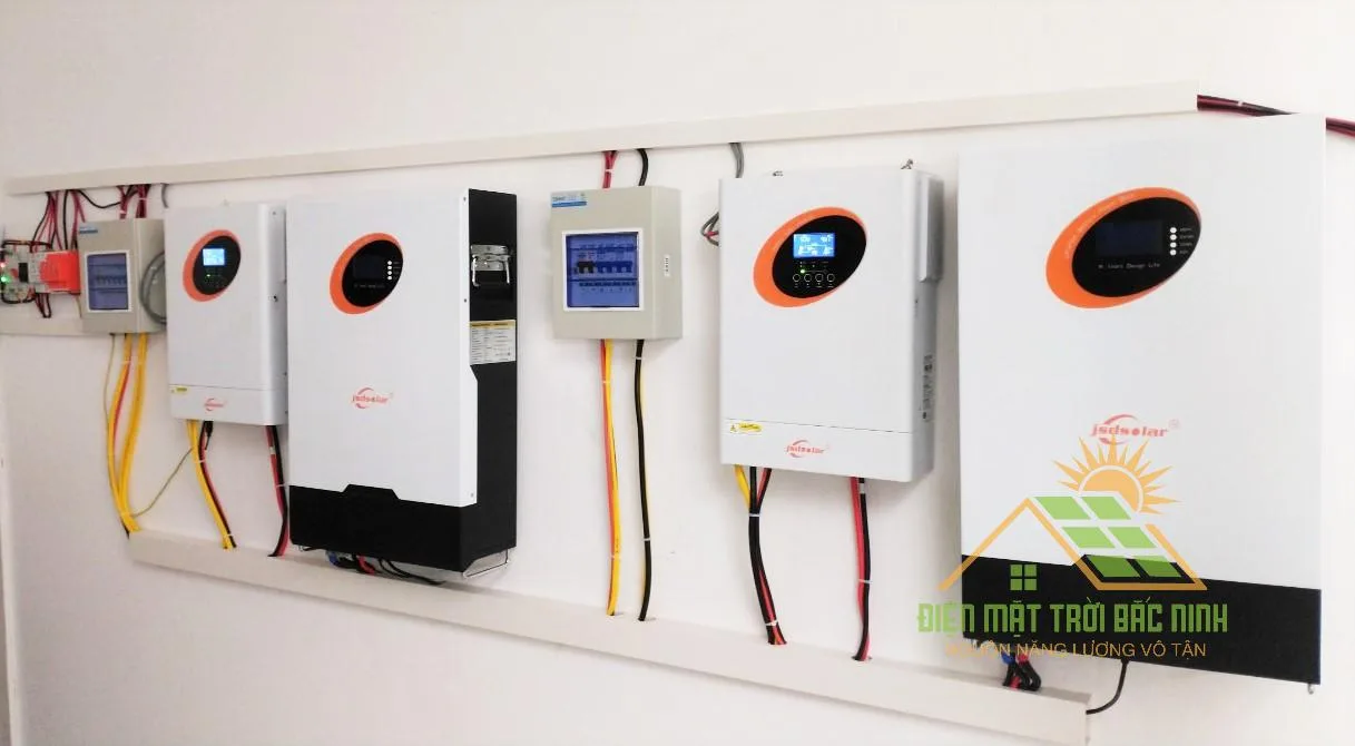 Chủ đầu tư sử dụng hai biến tần độc lập có bù lưới thương hiệu JSD Solar công suất 5KW/ mỗi biến tần, kèm theo đó là hai khối pin lưu trữ dung lượng 5,12 KWh/ khối. Các khố pin lưu trữ được lắp song song với nhau và lắp chung cho cả hai biến tần.