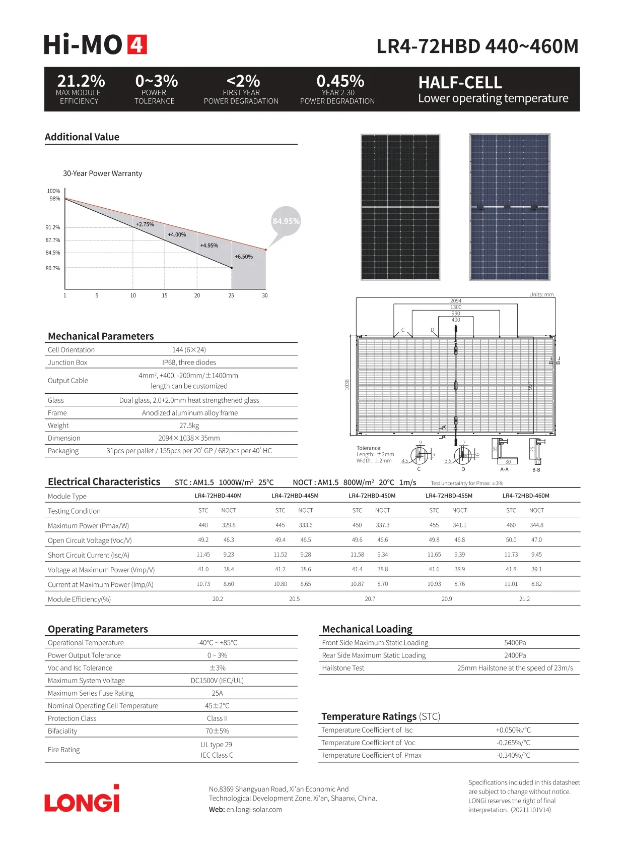 Công nghệ : N-Type, hai mặt kính . Loại cell : 144 (6×24), Mono- Haft Cell. Công suất đỉnh : 445 Wp. Hiệu suất : 20.5 %. Điện áp hở mạch (Voc) : 49.4 V. Điện áp ở công suất cực đại (Vmp) : 41.2 V. Dòng điện ngắn mạch (Isc) : 11.52 A. Dòng điện ở công suất cực đại (Imp) : 10.8 A. Kích thước (Dài*Rộng*Cao) : 2,094 * 1,038 * 35 mm. Trọng lượng : 27.5 Kg. Bảo hành vật lí : 12 năm. Bảo hành hiệu suất (trên 80%) sau : 30 năm.